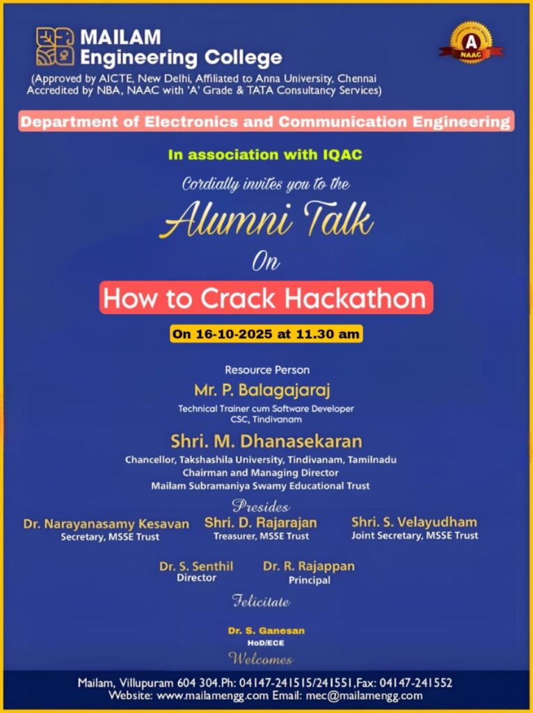 The Department of Electronics and Communication Engineering organized an Alumni Talk on the topic “How to Crack Hackathon” on 16.10.2025. This session aimed to guide students through effective strategies, preparation tips, and personal success stories for excelling in hackathons. The event allowed students to interact with alumni, gain practical insights, and boost their confidence in participating in competitive innovation challenges.