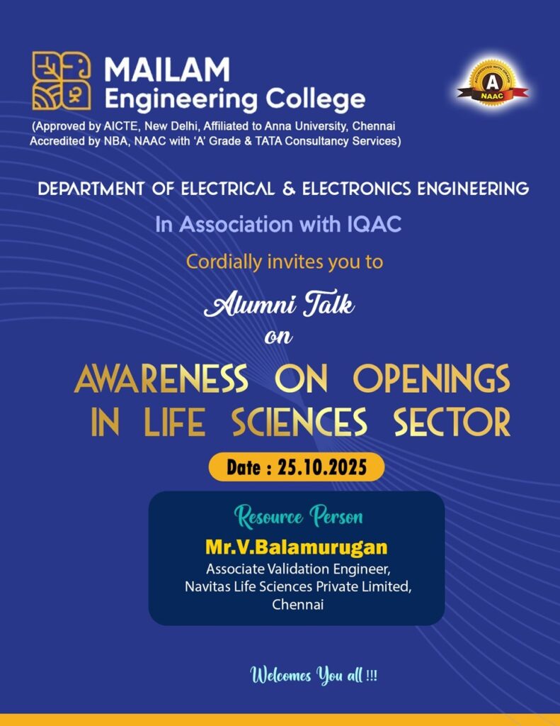 The Department of Electrical and Electronics Engineering at Mailam Engineering College, in association with IQAC, is hosting an alumni talk titled “Awareness on Openings in Life Sciences Sector” on October 25, 2025.