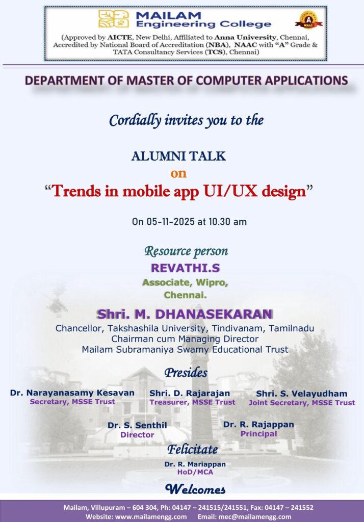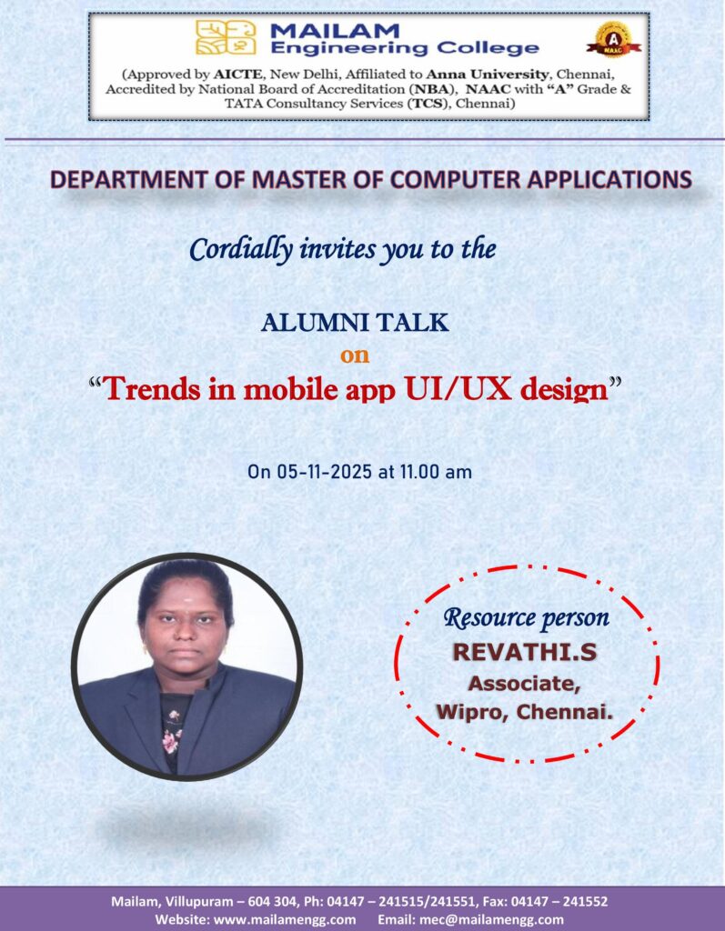 Join us for an insightful Alumni Talk hosted by the MCA Department on 5th October 2025 at 11:00 AM. Learn about the latest trends, best practices, and emerging innovations in mobile app UI/UX design from industry experts. Don’t miss this opportunity to gain practical insights and guidance for your career in app design.