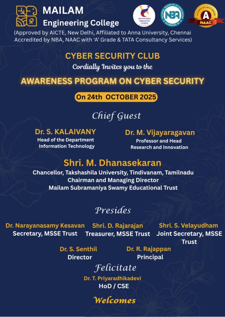 The Department of Computer Science and Engineering at Mailam Engineering College, through the Cyber Security Club in association with IQAC and IIC, is conducting an Awareness Program on Cyber Security on 24th October 2025 for all second and third-year MEC students.