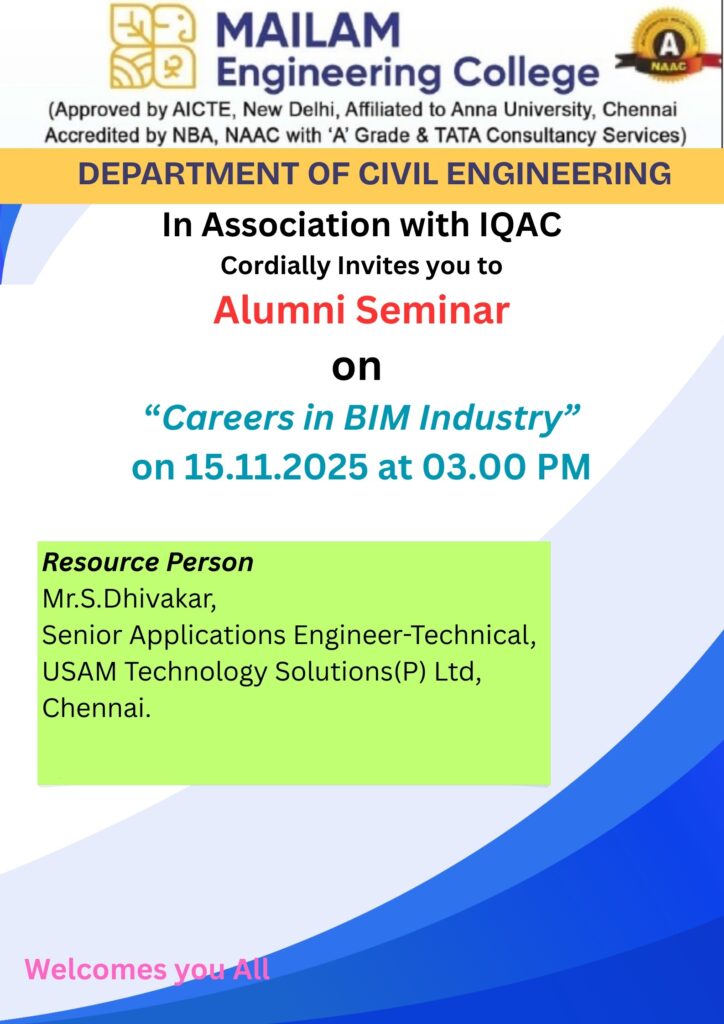 The Department of Civil Engineering is hosting an Alumni Seminar on November 15, 2025, focusing on “Careers in BIM Industry.” The seminar will feature a special talk by Mr. S. Dhivakar, Senior Application Engineering-Technical at USAM Technology Solutions (P) LTD, Chennai. Mr. Dhivakar will share his insights on the growing role of Building Information Modeling (BIM) in civil engineering and the exciting career opportunities it offers. This seminar is an excellent chance for students and professionals to learn from an expert and explore potential career paths in the BIM industry.