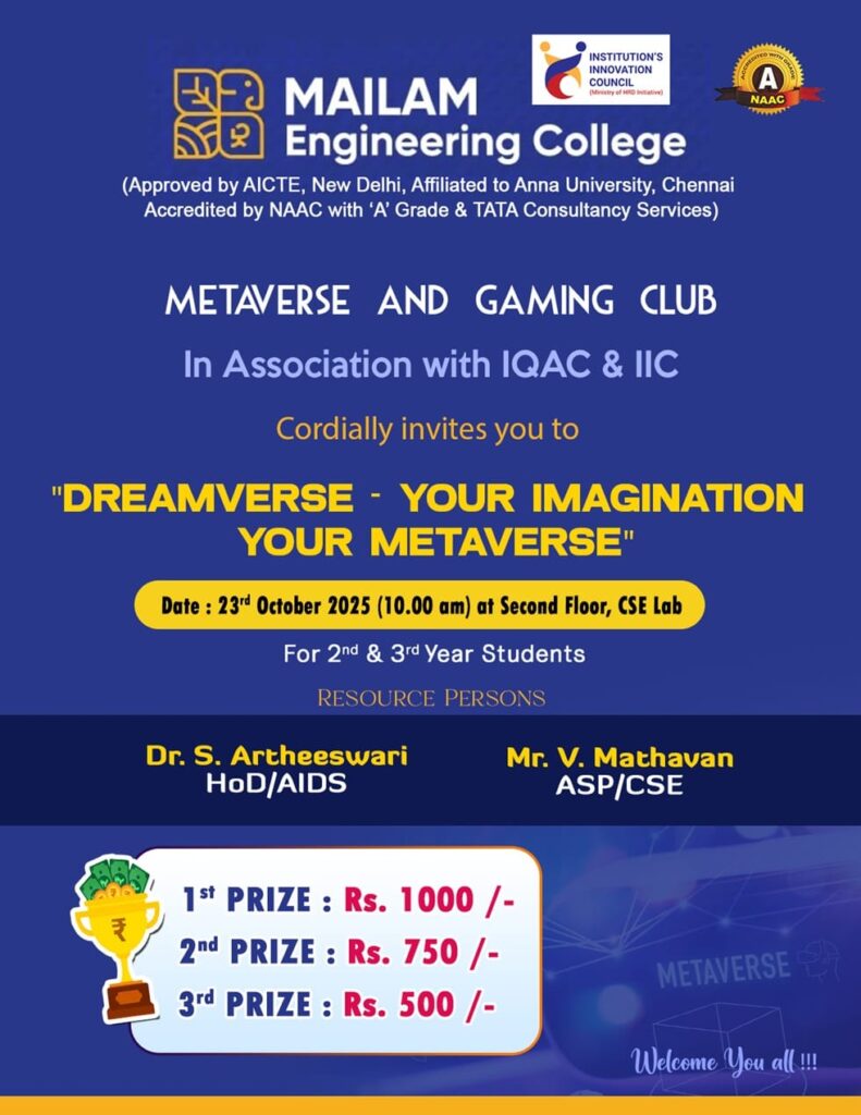 The Department of Computer Science and Engineering at Mailam Engineering College, through the Metaverse and Gaming Club in association with IQAC and IIC, is organizing an engaging event titled Dreamverse – Your Imagination, Your Metaverse.