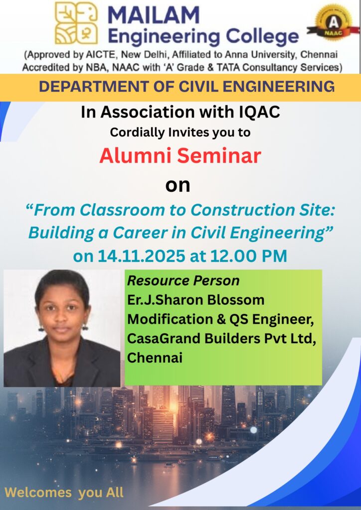 The Department of Civil Engineering is hosting an Alumni Seminar on November 14, 2025, titled “From Classroom to Construction Site: Building a Career in Civil Engineering.” The seminar will feature a special talk by Er. J. Sharon Blossom, Modification & QS Engineer at CasaGrand Builders Pvt Ltd, Chennai. Er. Blossom will share valuable insights into the transition from academic learning to practical application in the civil engineering industry, along with key tips for building a successful career on the construction site. This seminar is a great opportunity for students and aspiring engineers to gain real-world knowledge and advice from an experienced professional.