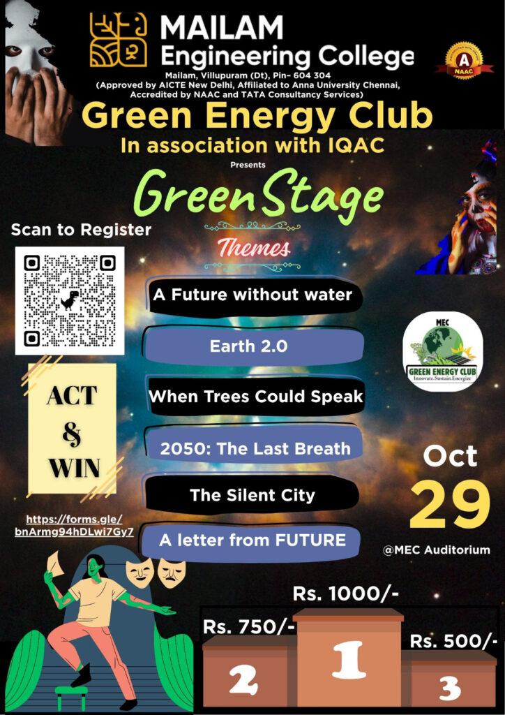 The Department of Electrical and Electronics Engineering, in association with the Green Energy Club and IQAC of Mailam Engineering College, is organizing Green Stage on October 29, 2025, at the MEC Auditorium.