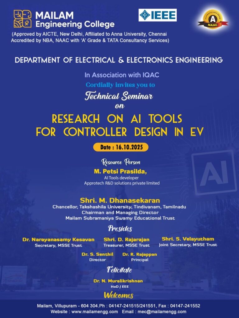 The Department of Electrical and Electronics Engineering (EEE) is pleased to announce a seminar on Research on AI Tools for Controller Design in Electric Vehicles (EVs), scheduled for October 16, 2025, at 2:00 P.M. in the Auditorium.
